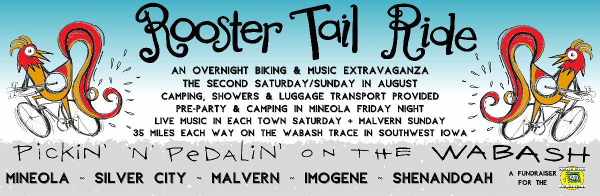 Started by the Wabash Trace in 2017, the Rooster Tail Ride is a mobile music festival made possible with the support of towns and businesses along the way. This ride is 35 miles each way, beginning in Mineola on Saturday morning (or Friday night, if you care to join in the pre-party & camping!) with live music stops in Silver City, at the Silver Creek Bridge, Malvern, Strahan, Imogene, and then reaching Shenandoah for the grand finale and overnight. Sunday you get up & do it all in reverse (Sunday music in Malvern and Silver City only)! Pork Belly is providing showers in Shenandoah - and possibly PHAT Rooms depending on the demand. We're always excited about helping out on this beauty of a trail in our own backyard!